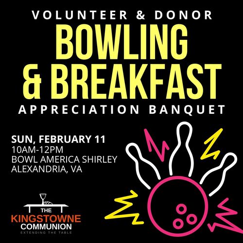 Next Sunday, the last Sunday before Lent, we're moving worship to Bowl America Shirley as a thank you to all our faithful volunteers and generous financial donors who make the mission and ministry of Kingstowne possible. We'll start with an acoustic song all together, brief morning prayer, and some words of gratitude, and then spend the rest of the time bowling, enjoying a continental breakfast buffet on Kingstowne, and just having fun together. Children are welcome. Advance RSVP is required by this Sunday, February 4.