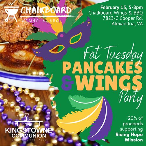 Join us for a Fat Tuesday night of pancakes, wings, and Mardi Gras fun for a good cause at Chalkboard Wings & BBQ before the season of Lent officially begins the next day. 20% of food and beverage sales from orders placed between 5pm and 8pm (including to-go orders) goes straight toward Rising Hope Mission, supporting families living in poverty along the Rt. 1 corridor; and the Kingstowne Communion will match whatever is raised through food and beverage purchases! There will also be a Pancake toppings bar, provided by the Kingstowne Communion, for an additional suggested donation of $5.00 (every dollar additionally supporting Rising Hope Mission). Advanced reservations suggested for one of three seatings.