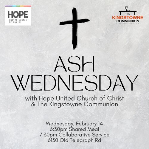Join the Kingstowne Communion and Hope United Church of Christ for a shared meal and collaborative Ash Wednesday worship service, Wednesday, February 14 at Hope UCC. Gather at 6:30pm for a shared potluck-style meal of soup, salad, and bread (check back for sign-up), followed by a collaborative worship service at with Hope UCC, at Hope UCC. Come be reminded that you are dust and to dust you will return as we begin to walk with Jesus toward the cross and empty tomb. Children are welcome. All are welcome.